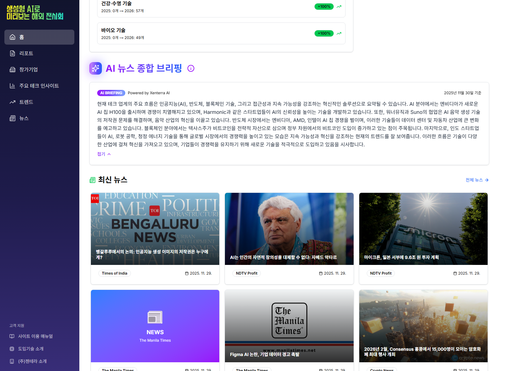 - AI 리포트 자동 업데이트: 각 기술 카테고리별로 AI가 매일 최신 트렌드 리포트를 자동 생성합니다.