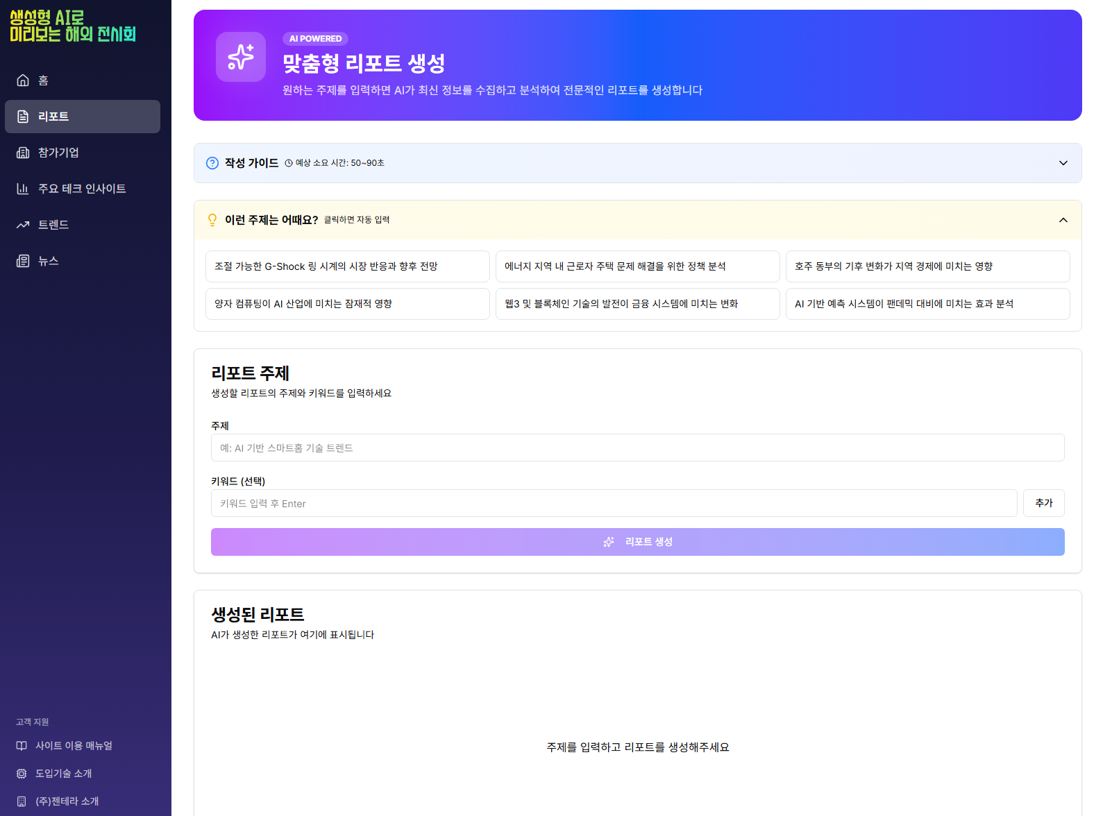 원하는 주제와 키워드를 입력하여 AI 기반의 전문적인 리포트를 즉시 생성할 수 있는 기능입니다.