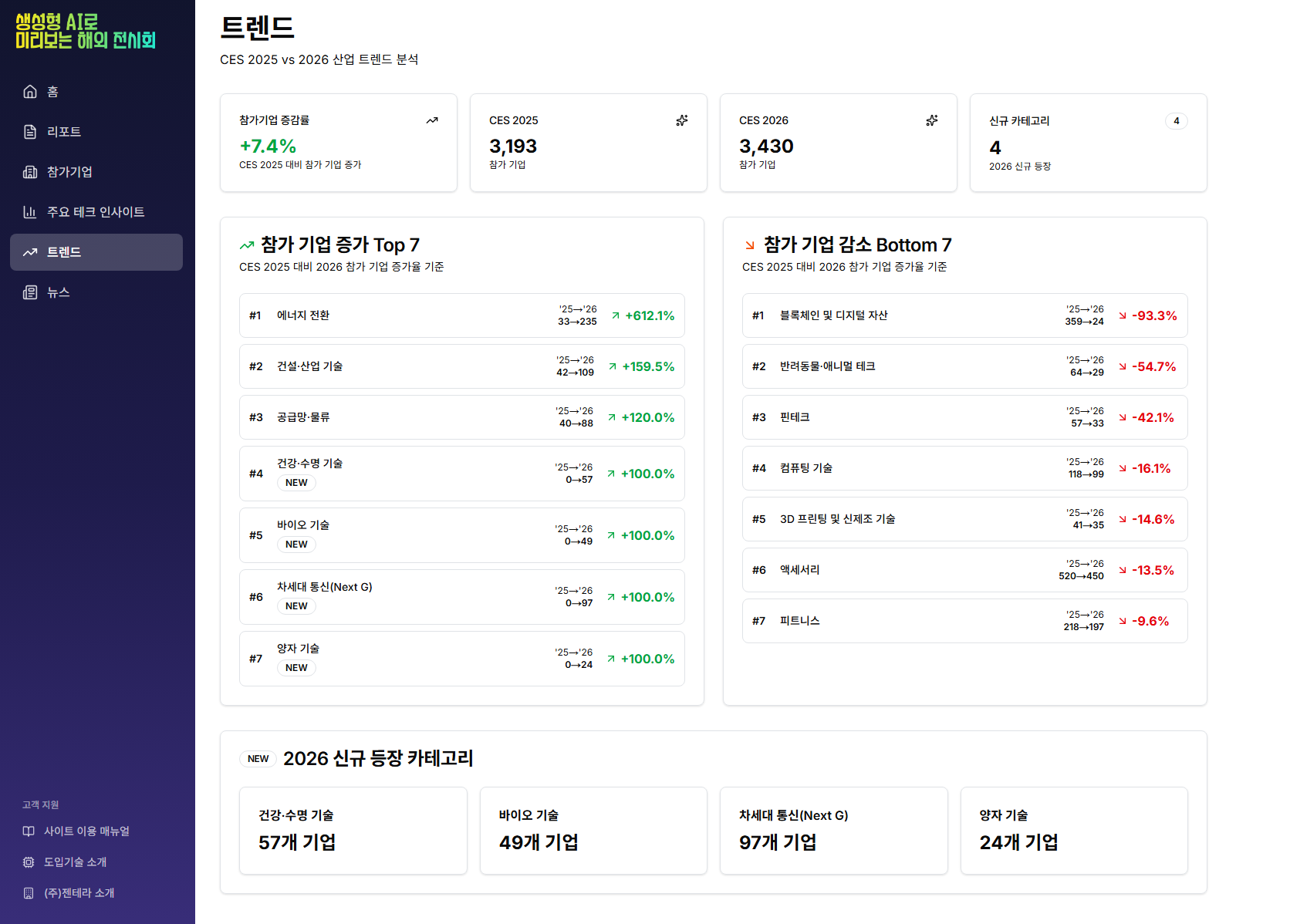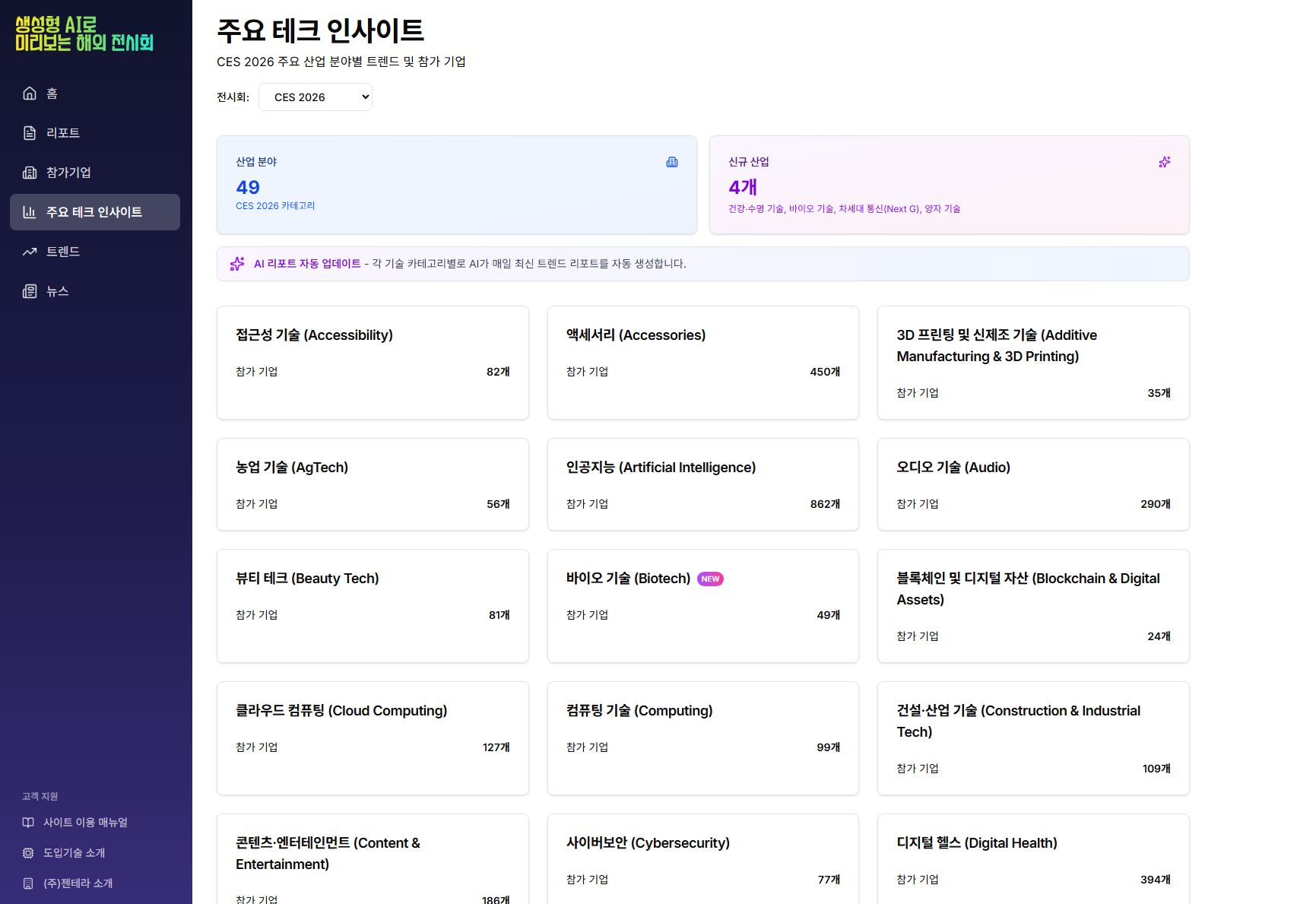 - 측면 네비게이션 바: 리포트, 참가기업, 주요 테크 인사이트, 트렌드, 뉴스 등 주요 메뉴로 빠르게 이동할 수 있습니다.
