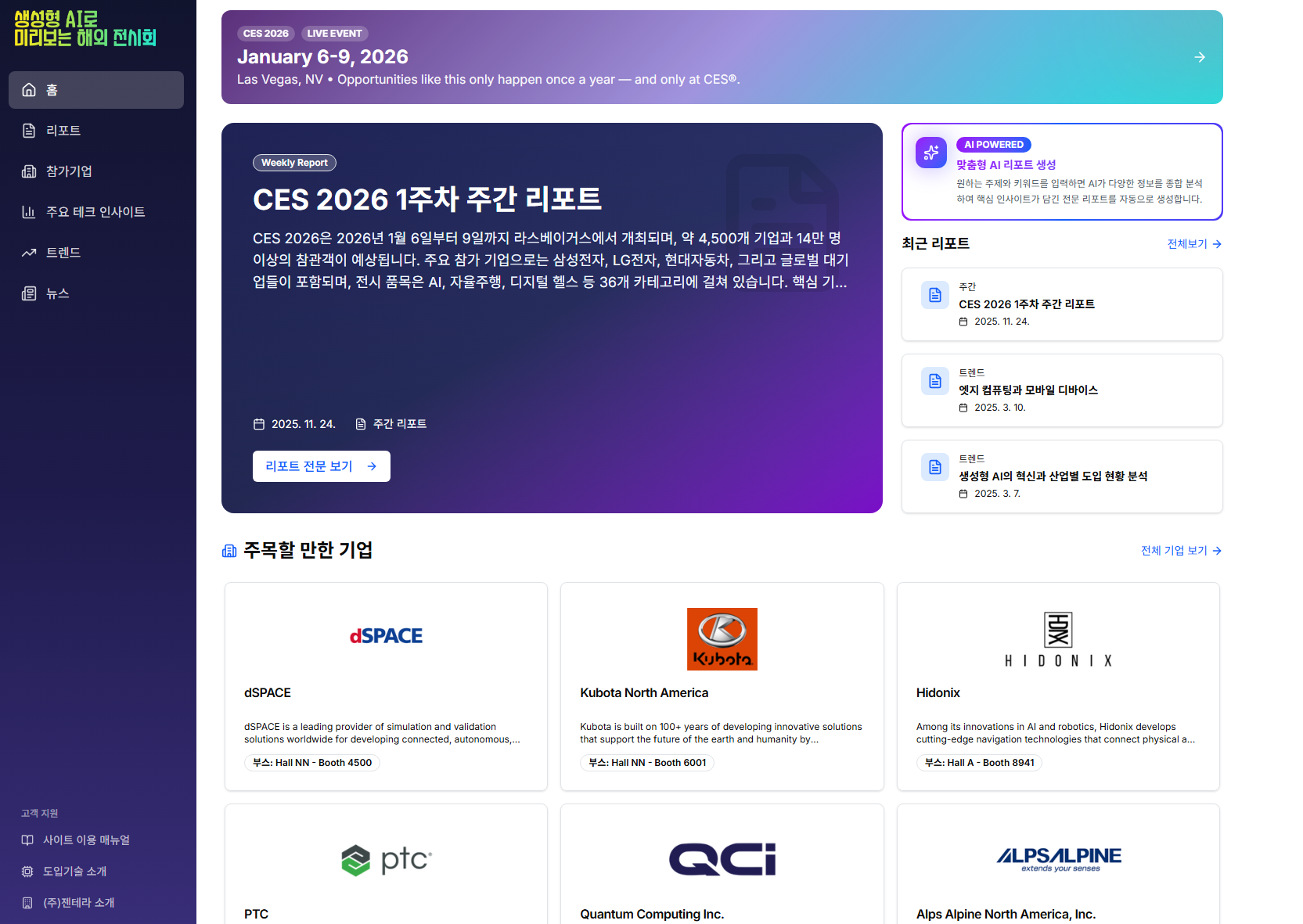 본 플랫폼은 생성형 AI 기술을 활용하여 CES, MWC 등 주요 글로벌 전시회의 최신 동향, 참가 기업 정보, 산업 트렌드를 심층 분석하고 맞춤형 리포트를 제공합니다.