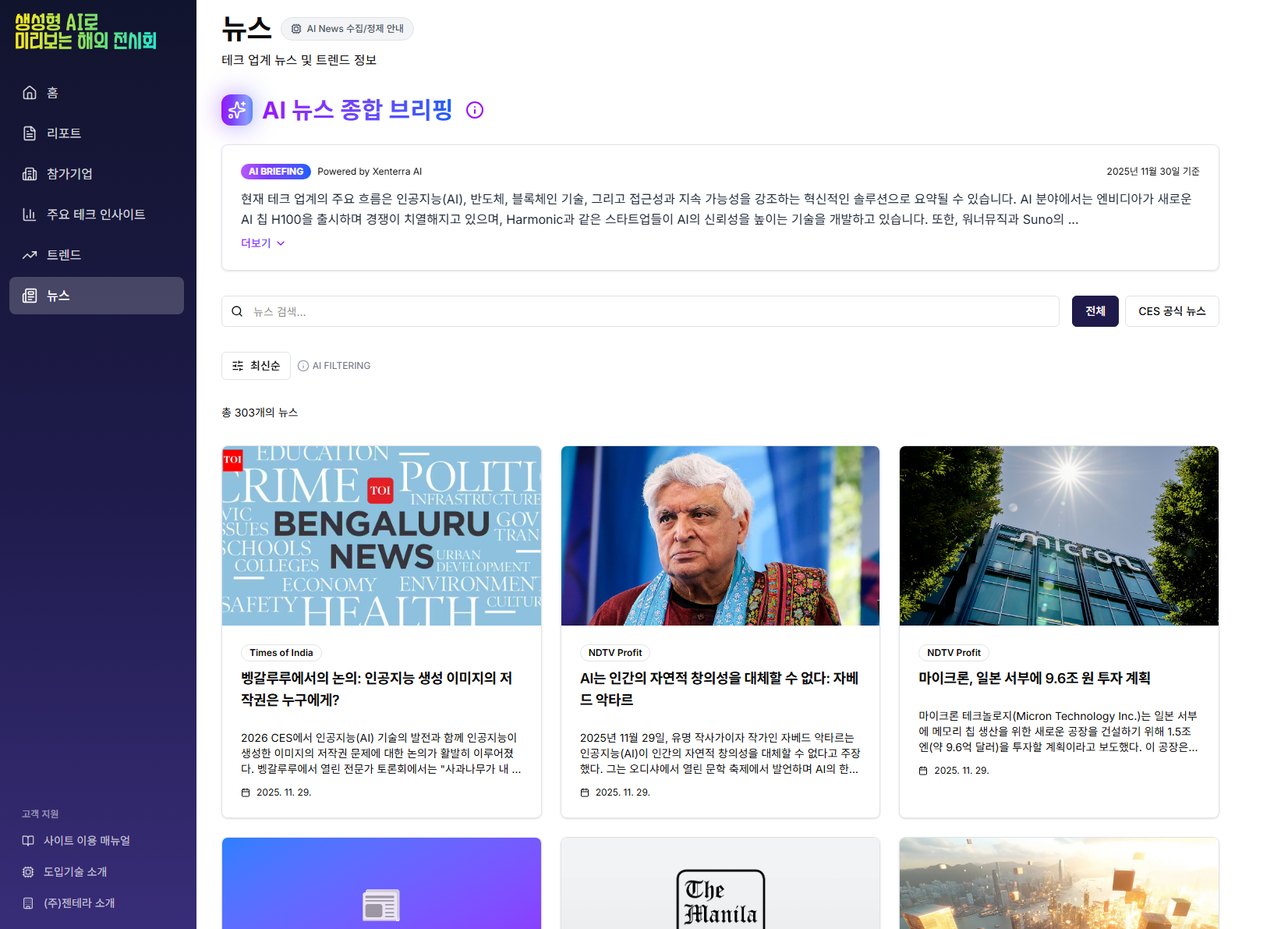 AI News 수집/정제 안내버튼을 클릭하면 뉴스 수집 및 분석 과정을 확인할 수 있습니다. - AI 브리핑: AI가 최신 기술 및 산업 관련 뉴스를 선별하고 요약합니다.
