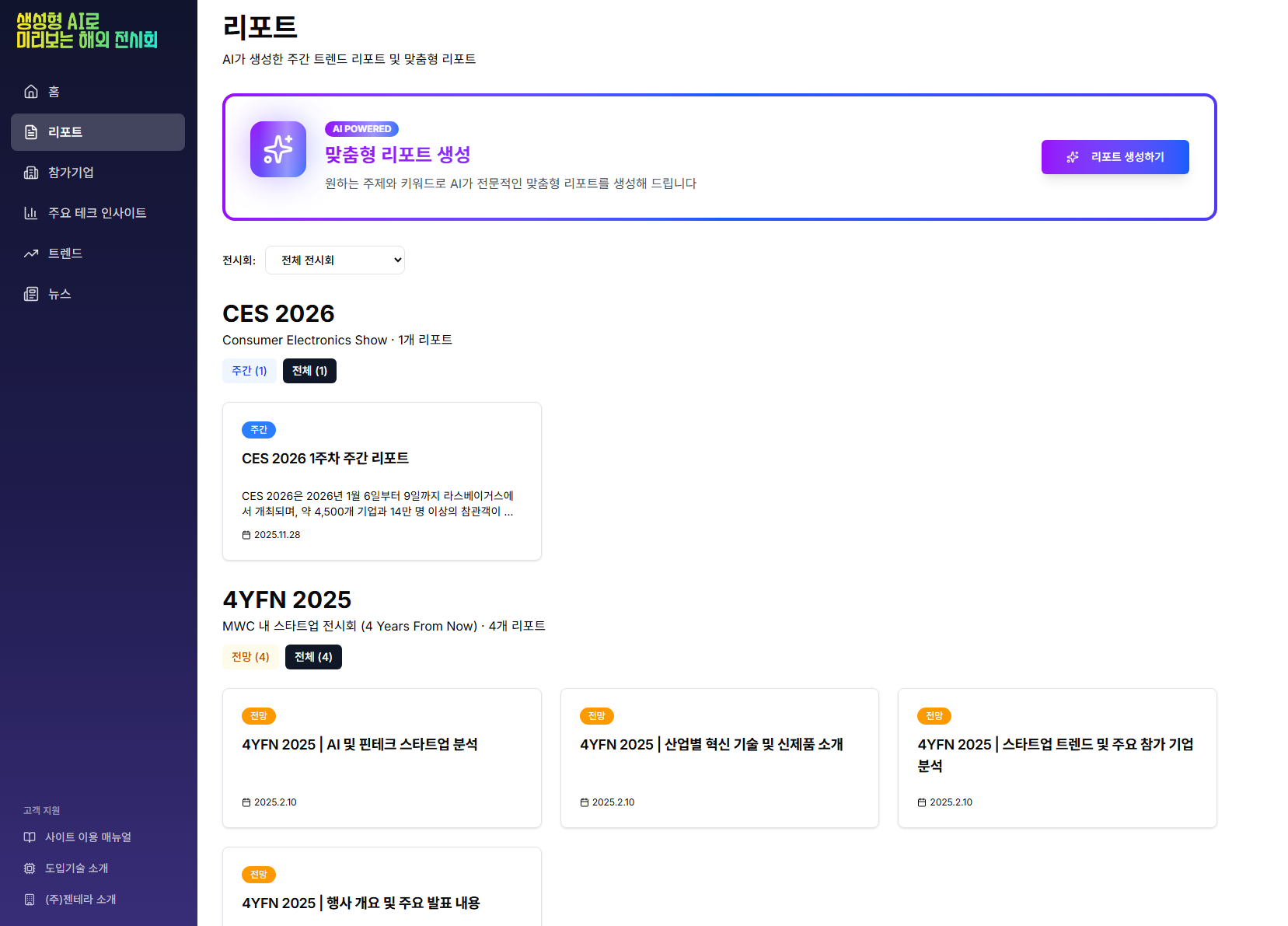 - 전시회 필터: 상단 탭에서 전시회(CES 2026, 4YFN 2025, MWC 2025, CES 2025)별로 리포트를 필터링할 수 있습니다.